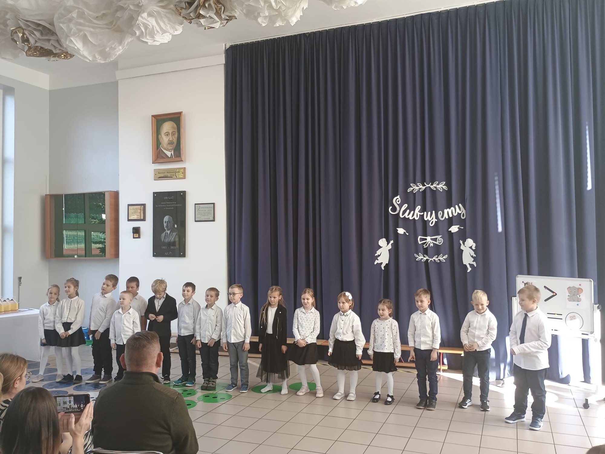 Uroczystość rozpoczęła się wierszem powitalnym, który z humorem i tremą przywitał wszystkich zgromadzonych, zapraszając do wspólnego oglądania przedstawienia przygotowanego przez pierwszoklasistów. Mali aktorzy, mimo lekkiego zdenerwowania, wspaniale odegrali swoje role. W kolejnych scenkach uczniowie opowiadali o emocjach związanych z rozpoczęciem nauki, wspominali przedszkole, a także prezentowali, jak przygotowani są do nowej roli – ucznia szkoły podstawowej. Dzieci z zaangażowaniem recytowały wiersze, śpiewały piosenki, tańczyły i odpowiadały na pytania dotyczące swojej szkoły.