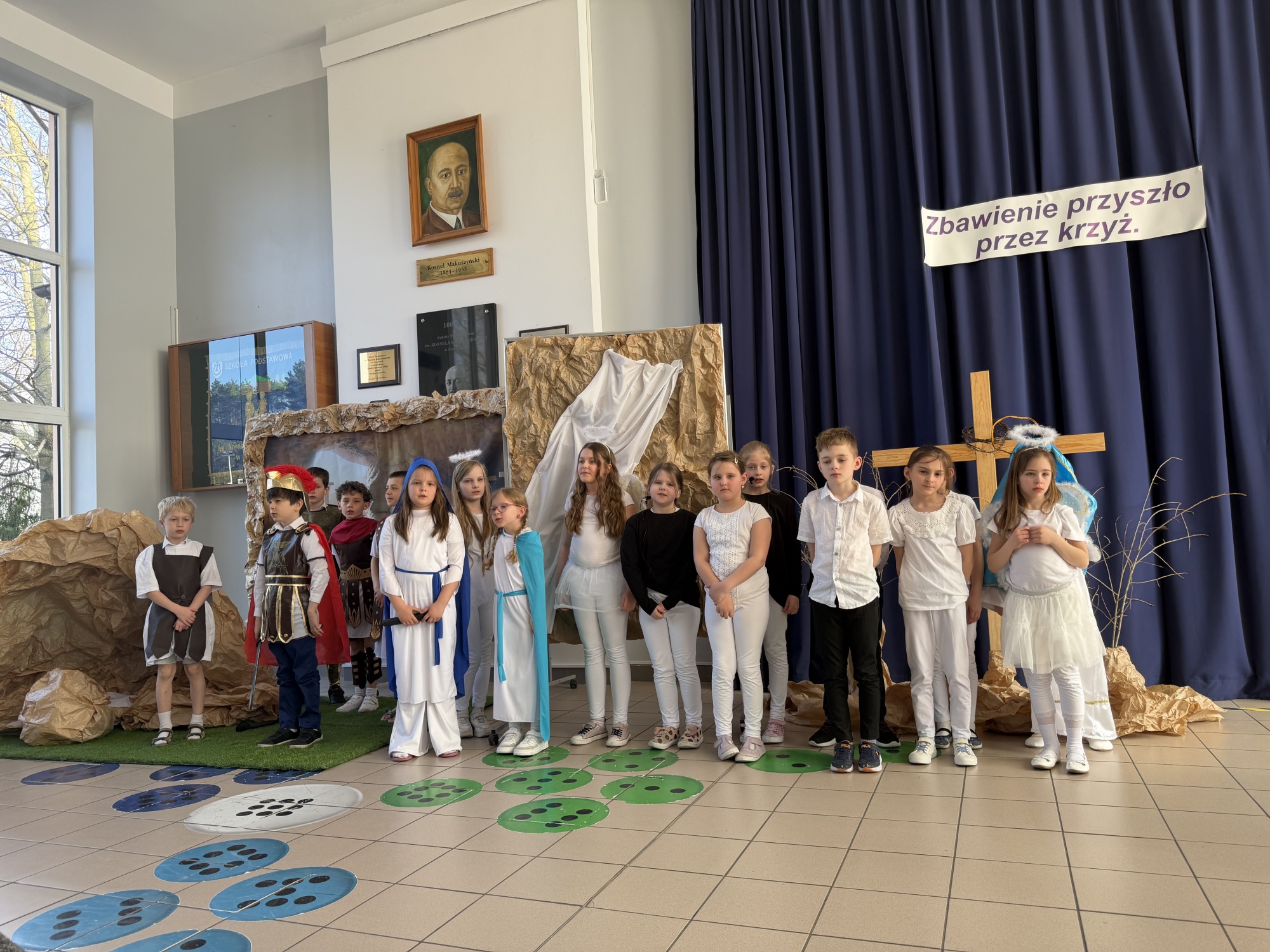 Dziś uczniowie klasy 2 oraz klasy 5 naszej szkoły zaprezentowali wyjątkowe przedstawienie wielkanocne, które zachwyciło wszystkich zgromadzonych swoją głębią i refleksyjnością. Młodzi aktorzy w piękny sposób przypomnieli o duchowym wymiarze Świąt Wielkanocnych, ukazując ich znaczenie poprzez starannie przygotowane sceny pełne symboliki i emocji. Ich zaangażowanie, talent oraz wrażliwość sprawiły, że widowisko było nie tylko wzruszające, ale także niosło ze sobą przesłanie nadziei, odrodzenia i wspólnoty. Całość została przygotowana z dużą starannością, co było widoczne zarówno w scenografii, jak i w kostiumach oraz muzyce towarzyszącej występom.