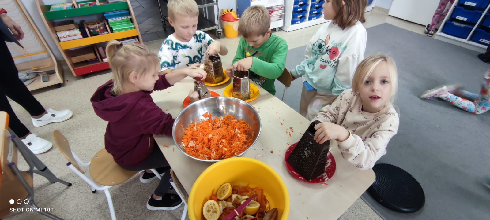 wypróbowały swoje siły podczas wykonywania surówki z marchewki i jabłek. Niektórzy byli zaskoczeni, że starcie marchewki wymaga użycia dużej siły. Starte produkty dzieci doprawiły sokiem z cytryny oraz miodem. Zajęcia zakończyły się spożyciem bomby witaminowej.