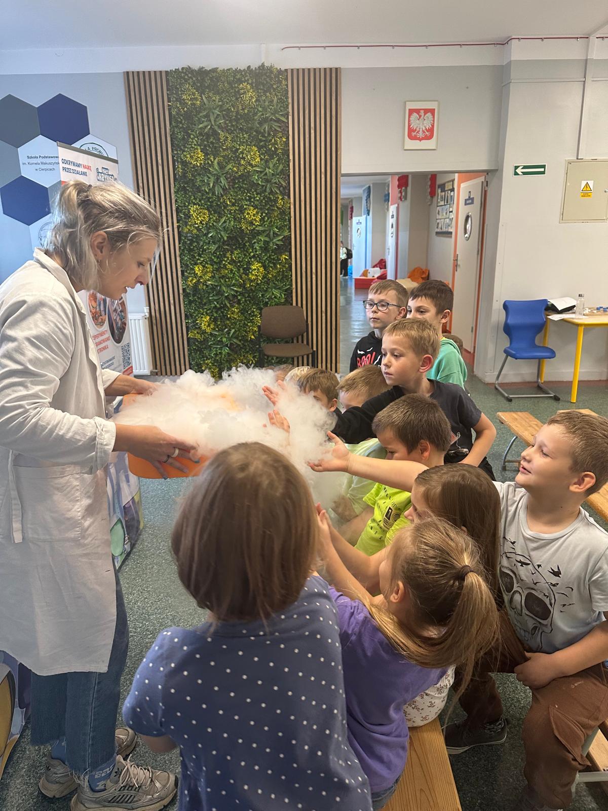 Zajęcia oparte były na doświadczeniach z wykorzystaniem suchego lodu, dzięki czemu dzieci mogły w ciekawy i bezpieczny sposób poznać tajemnice chemii.