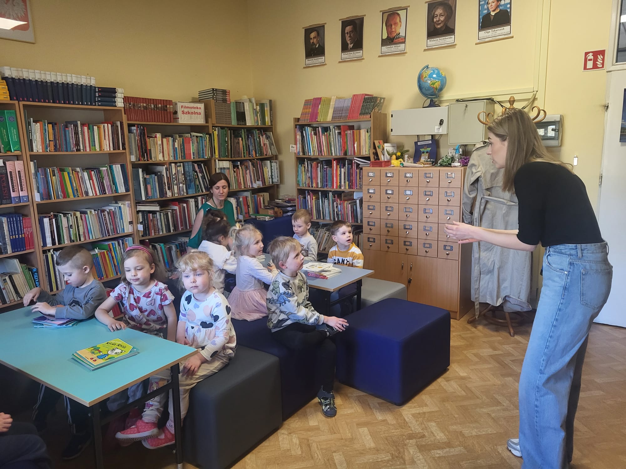 Dzieci z grupy „Żółwiki” odwiedziły bibliotekę szkolną, gdzie miały okazję poznać jej zasady funkcjonowania oraz bogaty księgozbiór. Podczas wizyty przedszkolaki z zainteresowaniem słuchały opowieści o książkach. Spotkanie przebiegło w miłej atmosferze i zachęciło dzieci do częstszego sięgania po książki.